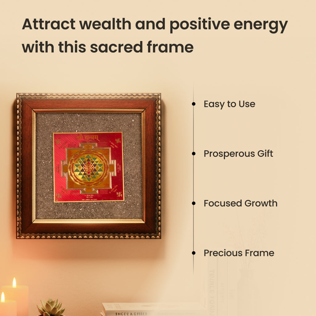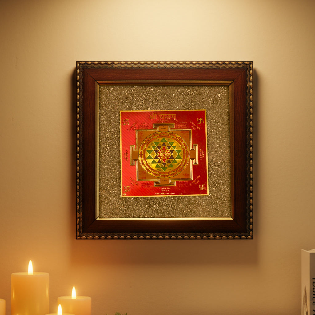Combines raw pyrite’s grounding energy with the Shree Yantra’s sacred power.