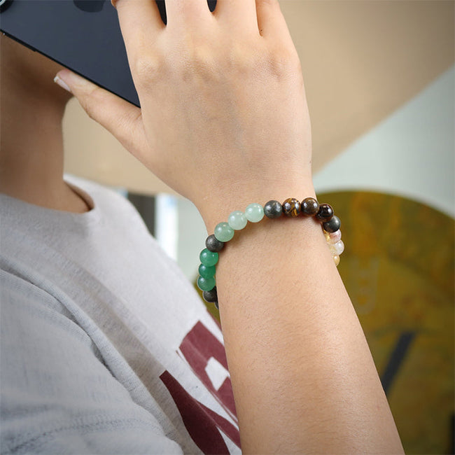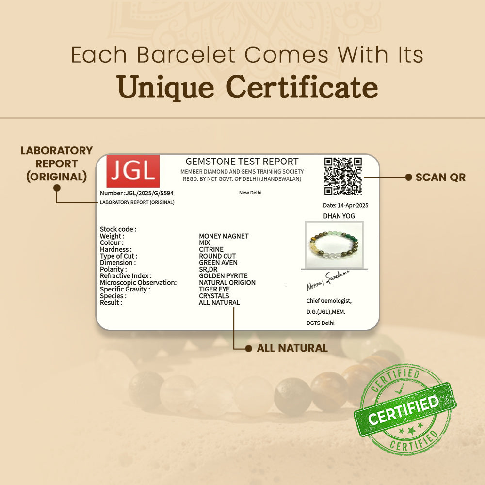 This Dhan yog bracelet is super powerful because it has been designed with 6 powerful money magnet crystals, which are Citrine, Tiger Eye, Clear Quartz, Green Jade, Green Aventurine, and a Raw Pyrite. Wearing this bracelet daily supports financial focus, stability, and abundance thinking. It is a premium choice for abundance seekers.