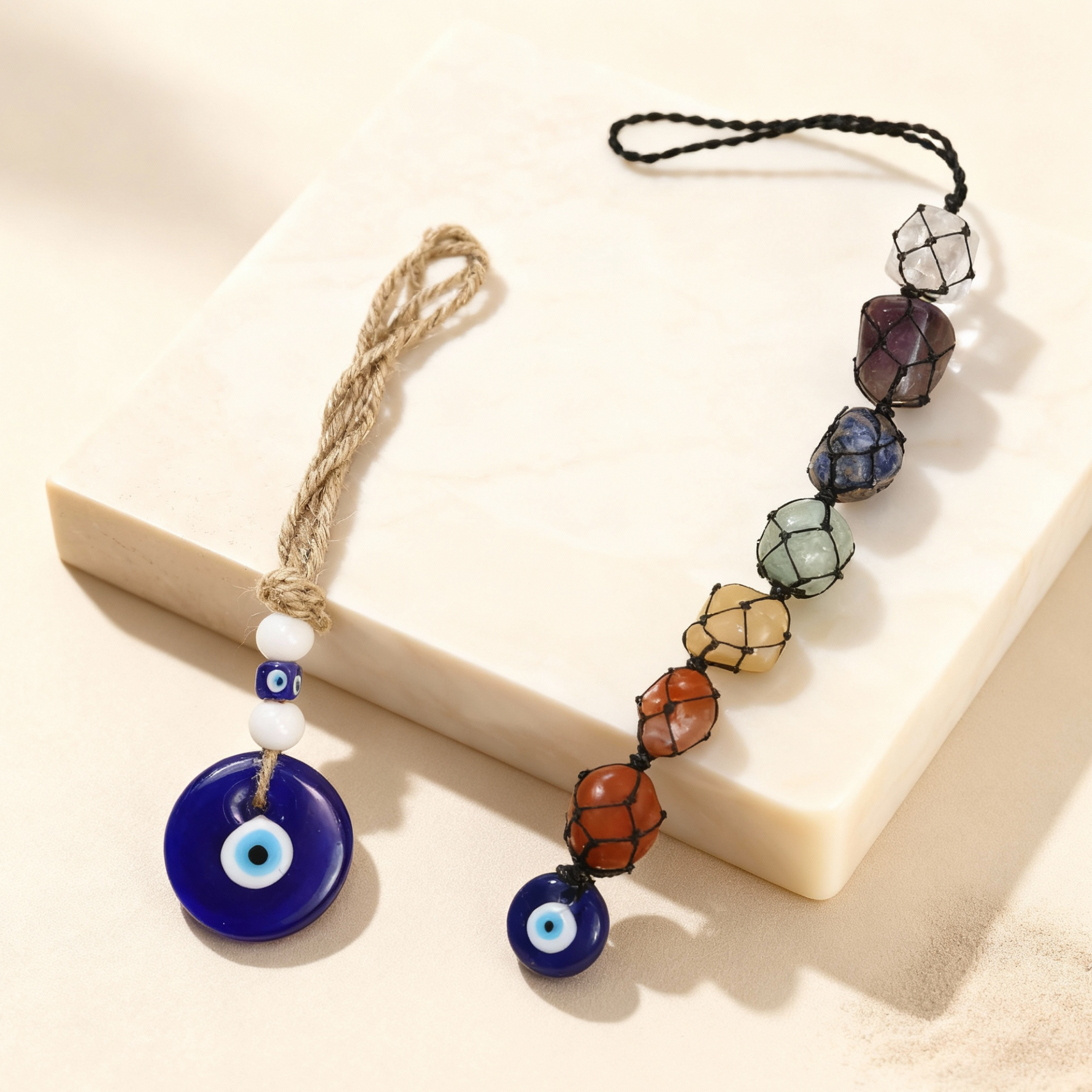 Bring positivity your way with this trendy Protect & Glow Combo featuring an Evil Eye Hanging and a 7 Chakra Evil Eye Hanging. Together, they attract good vibes, balance energies, and keep negativity away. Aesthetic and meaningful, this combo is also perfect for gifting your loved ones.