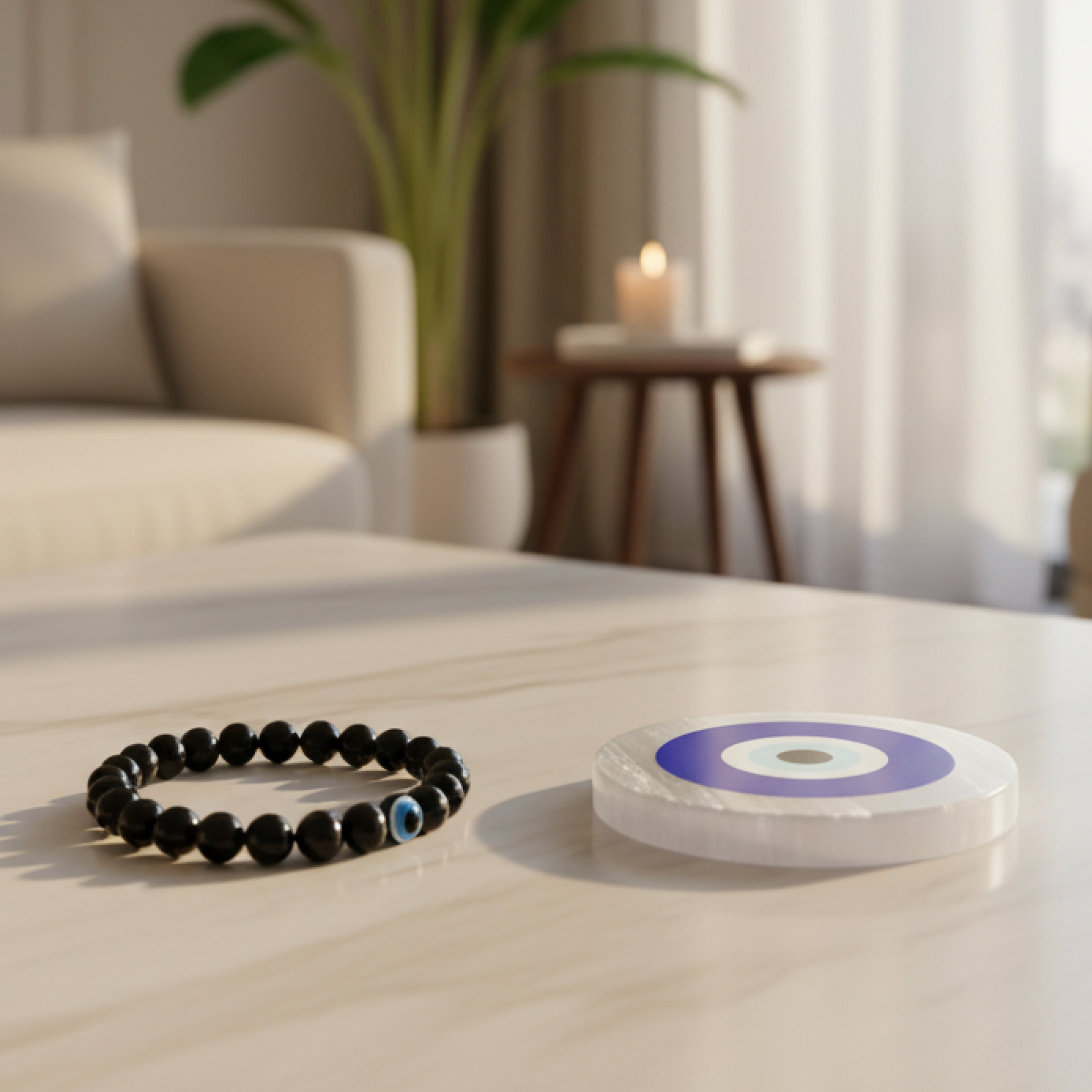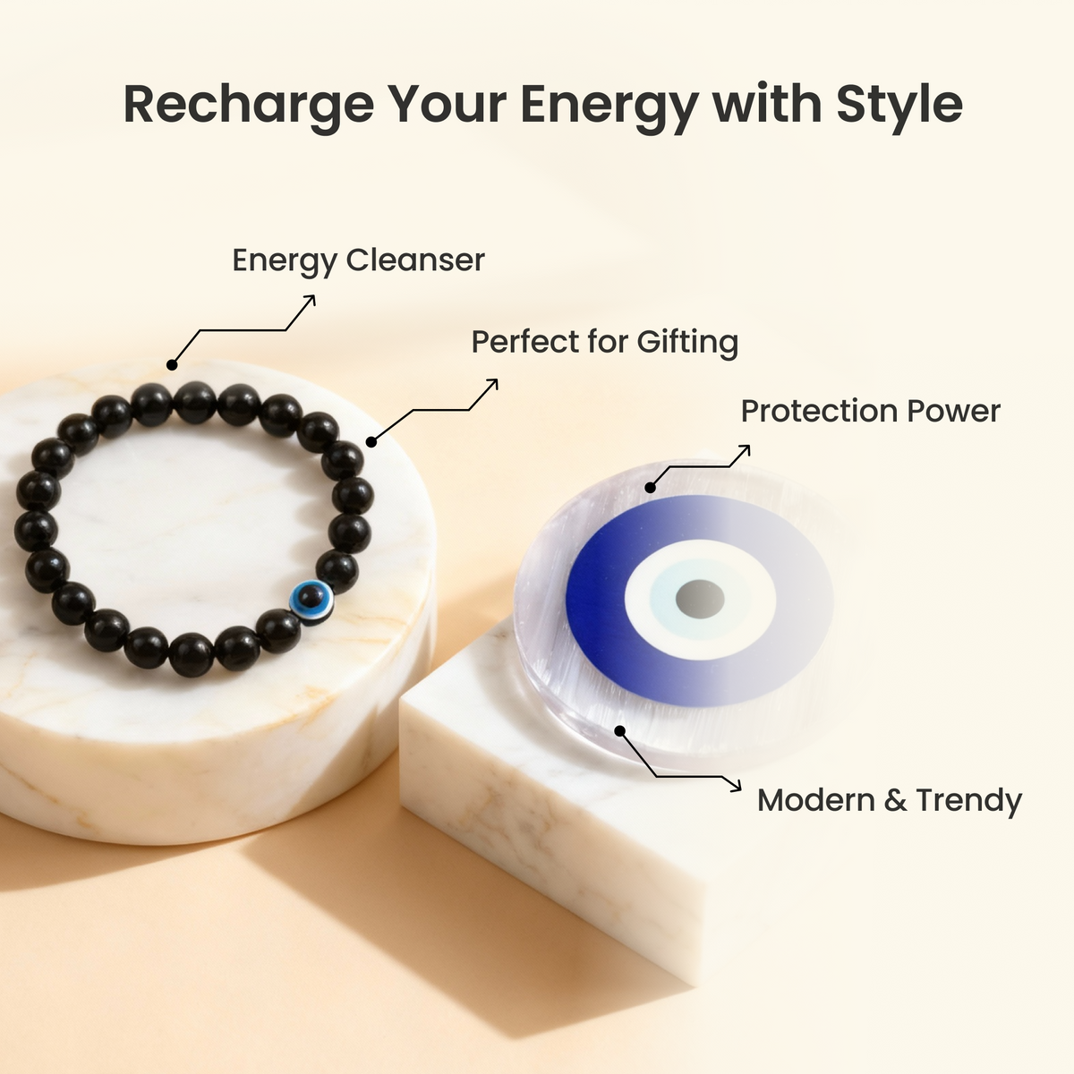 This trendy Evil Eye Bracelet with Evil Eye Charging Plate (A Selenite Plate with an Evil Eye Symbol) is your all-in-one protection booster combo. The Evil Eye Bracelet shields you from negativity, while the Selenite Plate recharges and cleanses its energy. Aesthetic, purposeful, and perfect for gifting, this combo balances protection with positive vibes every day.