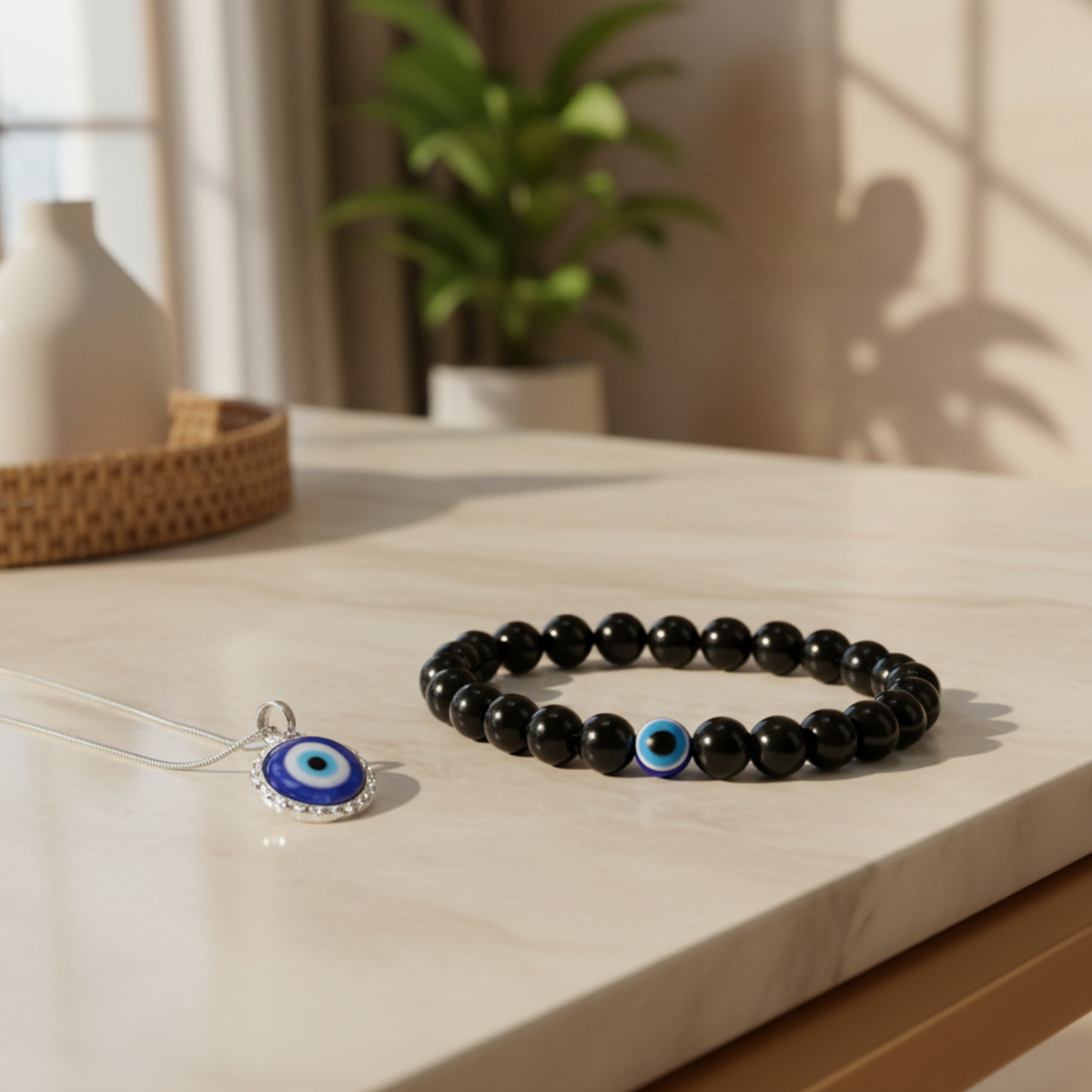 This stylish Evil Eye Combo includes an original evil eye bead bracelet and pendant crafted to shield you from negative energies. This unisex combo is designed to suit both men and women beautifully. Both pieces are premium, aesthetic, and crafted for daily wear. Perfect for gifting, this combo enhances positivity while keeping you protected in style.