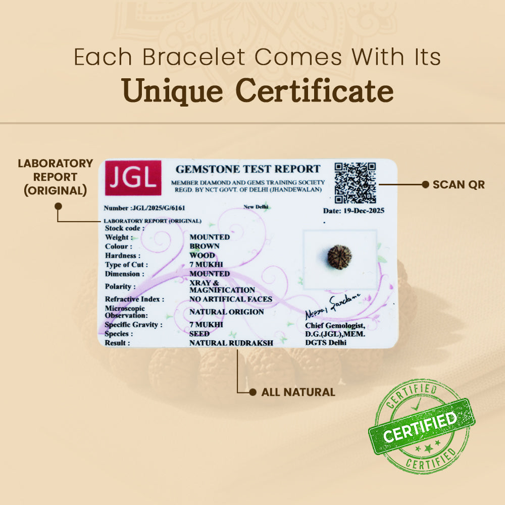 This Siddh 7 Mukhi Rudraksha Bracelet is made from natural, lab-certified Rudraksha beads and combines traditional healing with modern style. The 7 Mukhi Rudraksha bead represents Goddess Lakshmi, bringing wealth, prosperity, and focus. Made from natural, lab-certified Rudraksha beads, this bracelet combines traditional healing with modern style. Also, each bead in this bracelet has been specially blessed and energized through sacred Vedic rituals by an experienced priest at a temple, so it carries positive energy. Trusted by experts and astrologers, it is both a spiritual tool and a fashionable accessory that connects you to higher vibrations.