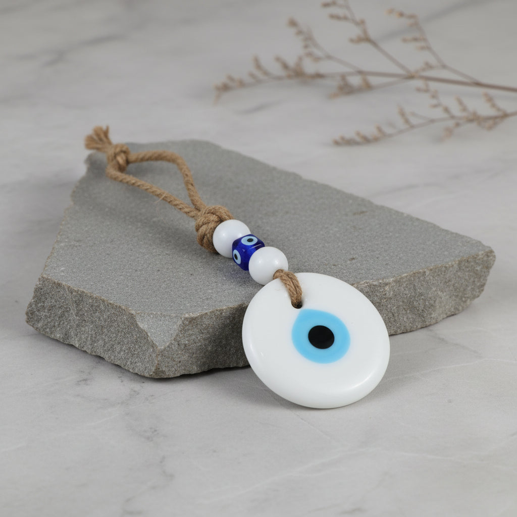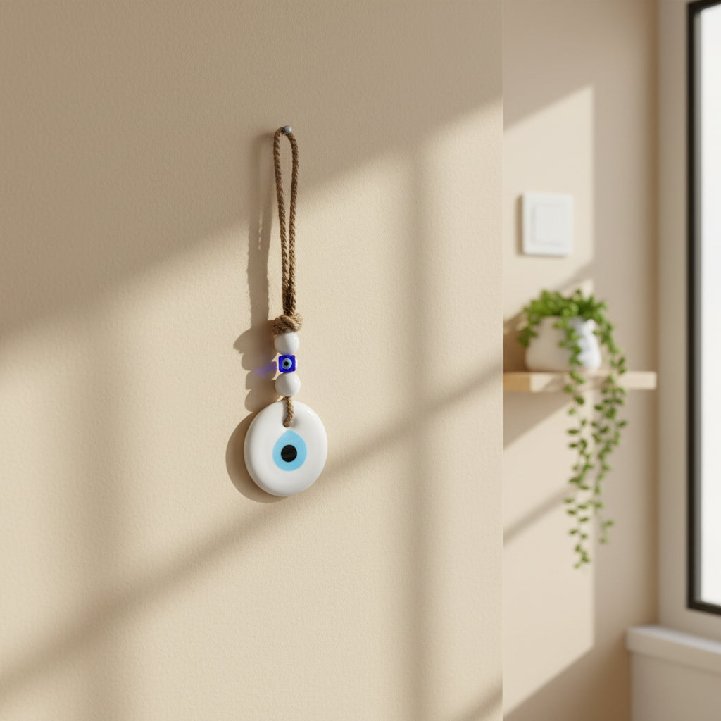 This large white hanging with an Evil Eye symbol is an aesthetic decor piece for main areas like entrances, living rooms, or offices. Its simple white color creates a calm and clean look, while the Evil Eye is believed to protect against negative energy. The design blends easily with both modern and traditional interiors, adding style and positive vibes.